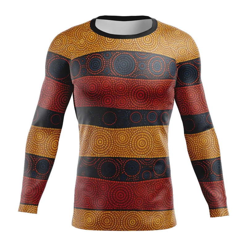Hit the trails in a long-sleeve MTB jersey inspired by Aboriginal dot-paintingearthy reds, ochres, and charcoal bands. Regular, ride-ready cut for trail, enduro, and bike-park laps. Not thermal by defaultadd the optional thermal upgrade in the product menu