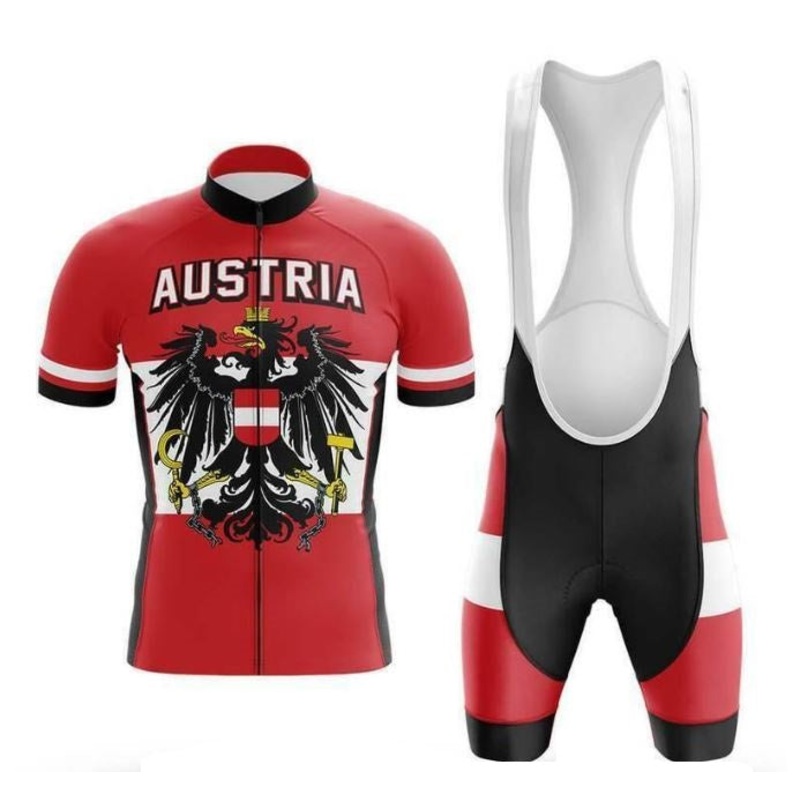 This Austria cycling set is fashionable & comfortable. It includes a cycling jersey and matching cycling shorts. The Cycling Jersey:Regular fit.Moisture wicking, quick dry fabric. Front concealed zipper for increased ventilation.Three rear pockets to store