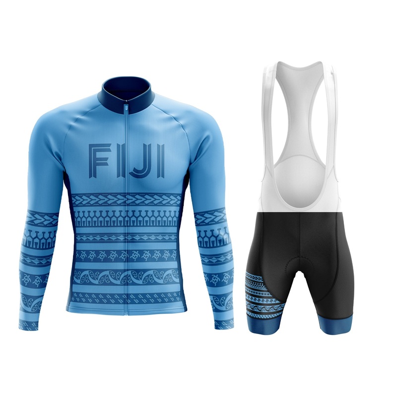 Fijilong sleeve cycling kit.Discover lots more great cycling clothes from many countries around the worldover here.The Jersey:Regular fitO-Collar.Front concealed zipper.Three rear pockets.Internal silicone waist gripper.Ventilated side mesh.The Shorts:Perf