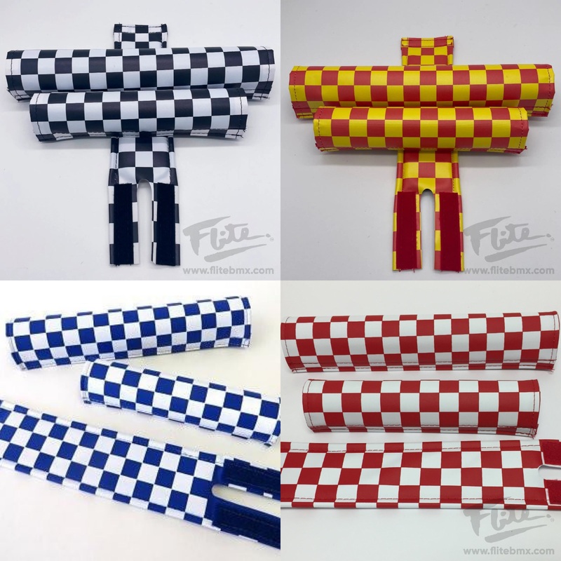 Flite BMX 3-piece pad setClassic 3 piece BMX padset nylon made with velcro closureColors available: Black and White, Blue and White & Red and White Checkerboard with no "Flite" logoUV resistant coated nylon keeps the color fresh looking for years to come!B