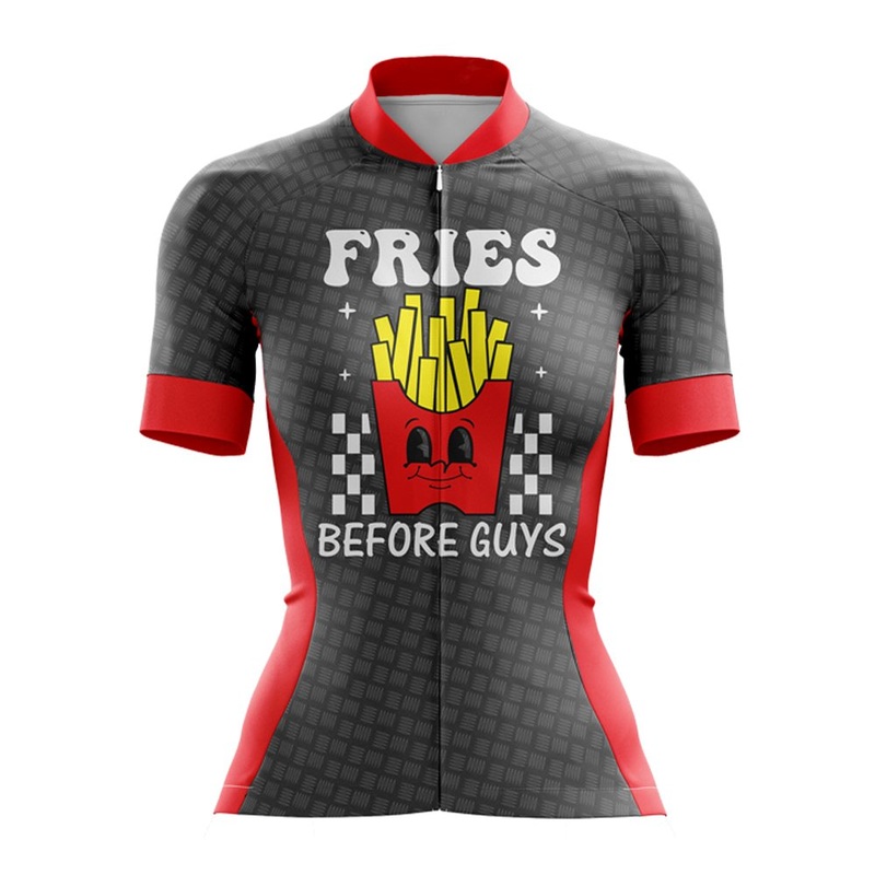 Fries Before Guys Womens Cycling JerseyDesign and StylePrioritize fun with the Fries Before Guys Bicycle Jersey, designed specifically for women. Perfect for female cyclists who love a playful statement, this high-quality jersey combines style and performa