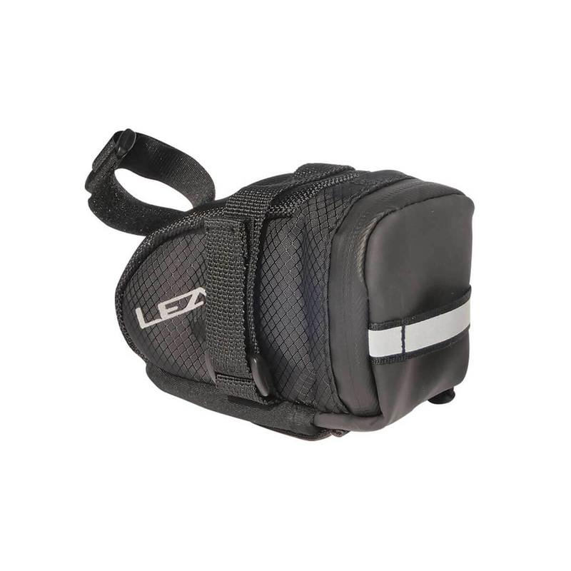 Medium, wedge-shaped saddle bag. Velcro straps attach to saddle rails and seat posts. Durable woven nylon construction. Labeled internal organizational pockets. External, quick access multi-tool sleeve. Reflective logos and loop increases night visibility.
