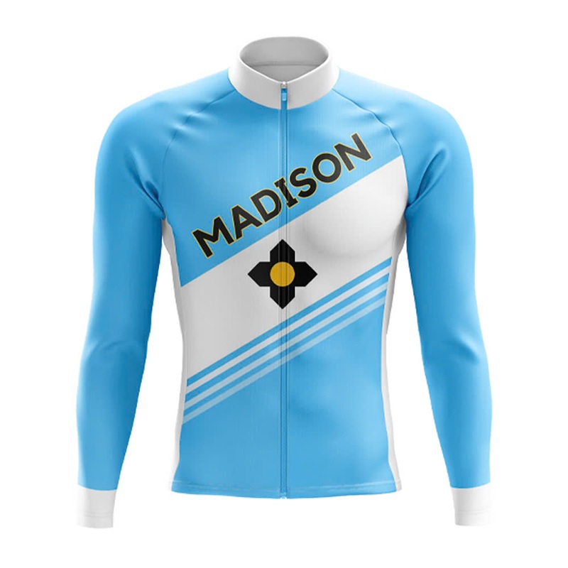 Celebrate Madisons cycling culture with this sleek long sleeve jersey. Featuring a design inspired by the citys vibrant energy, this jersey is perfect for tackling trails, roads, or city streets. Built for warmth and comfort, its ideal for cooler rides whi