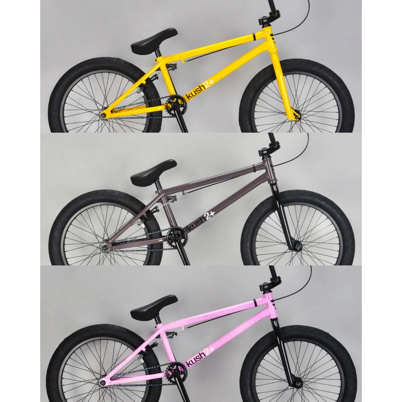 The Kush 2+ is the new benchmark entry BMX everyone is talking about! Not only does it look seriously fresh, its got the component spec to back up the looks. Includes coloured fat Lagos Crawler tyres, CNC machined internal headset, top load stem, Sealed mid BB, 4130 3-piece cranks, padded fixed seat, logo stamped gussets, double wall rims and curved seat stay bridge. The attention to detail is mind-blowing for a bike at this price point. Like all mafia BMXs the geometry is spot on and light-weight, with a super-smooth ride. The best ever entry level complete? We think so.