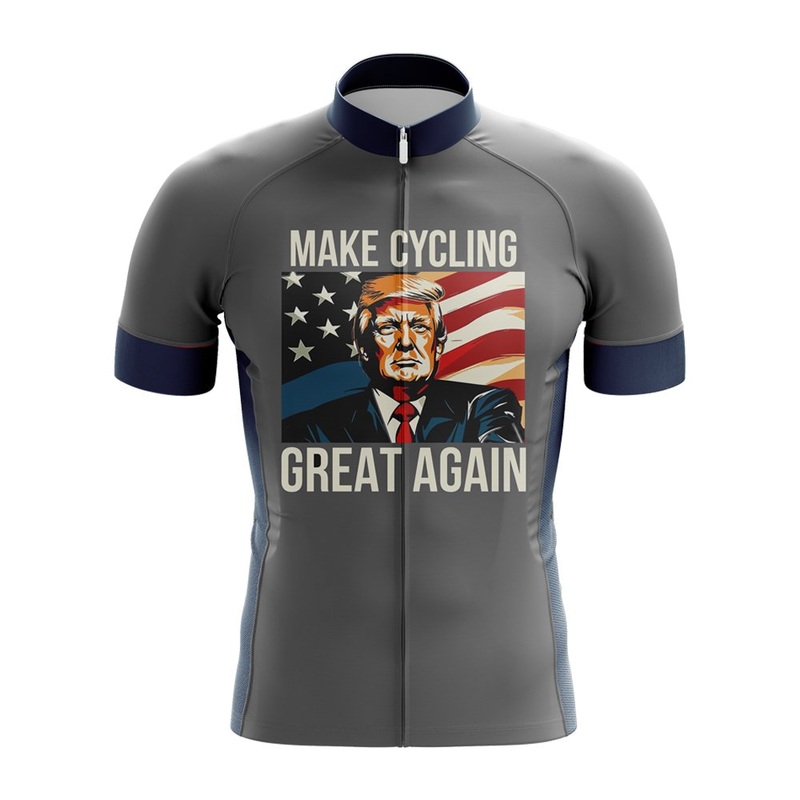 Show your sense of humor with the Make Cycling Great Again Bicycle Jersey, featuring a photo of Trump. Perfect for cyclists who enjoy a touch of political satire on their rides. This high-performance jersey is made from breathable, moisture-wicking fabric, ensuring comfort and style on every ride.