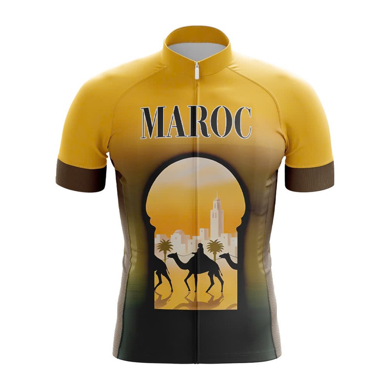 Embrace the beauty of Morocco with the Maroc Cycling Jersey. Featuring a sandy-toned background and a stunning image of a camel framed by a traditional archway, this jersey captures the spirit of the desert and Moroccan architecture. Designed for comfort and performance, its perfect for cyclists who love cultural and scenic inspiration on their rides.