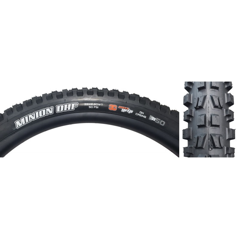 Maxxis Minion DHF Tire - 29 x 2.50 Tubeless Folding Black 3CG DH Wide Trail E-50. The Minion DHF has become the benchmark for riders wanting maximum control in loose and muddy conditions.Directional ramped center knobs provide low rolling resistanceMinion