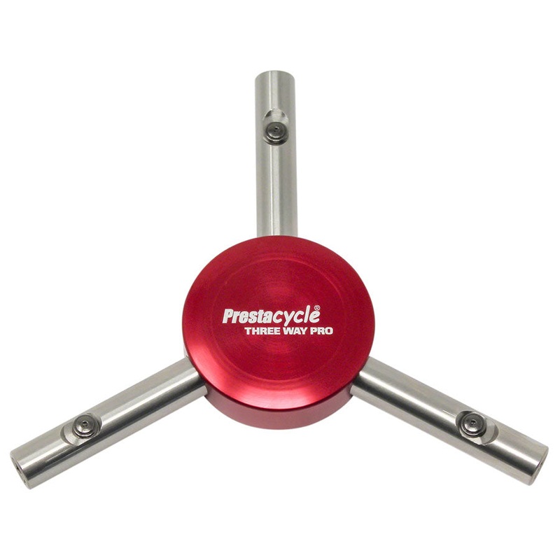 Prestacycle takes the popular 3-Way tool to a new level. Make your own. Use any 1/4 bit size in each of the three ends. Match your tool to the job at hand. When the tips wear-out, don’t throw away the tool, just replace the bit. Hardened steel core and Shafts with Stainless Steel drivers and CNC Machined body makes this tool incredibly strong. Works with any standard 1/4″ Bits including the many different Bicycle-Specific bits sets available from Prestacycle.