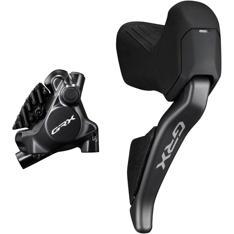 The Shimano 12-speed Shimano GRX Di2 Dual Control Lever delivers fast, wireless shifting for gravel and mixed-terrain riding. The ergonomic lever features raised hoods, ribbed surface texture, and an anti-slip coating on the brake lever for increased security and control. The hood body bracket shape is newly optimized for seamless integration with flared handlebars while retaining the gravel-specific third button location. To complete the cockpit, RX825 levers are compatible with three satellite shifter options (sold separately) and features Shimano FRONT SHIFT NEXT functionality to maximize rider customization options. The GRX BR-RX820 2-piston disc brake caliper brings a high level of control to gravel cycling with enhanced modulation and a quick initial braking point. Despite its smaller construction, the system is exceptionally quiet and easy to maintain.