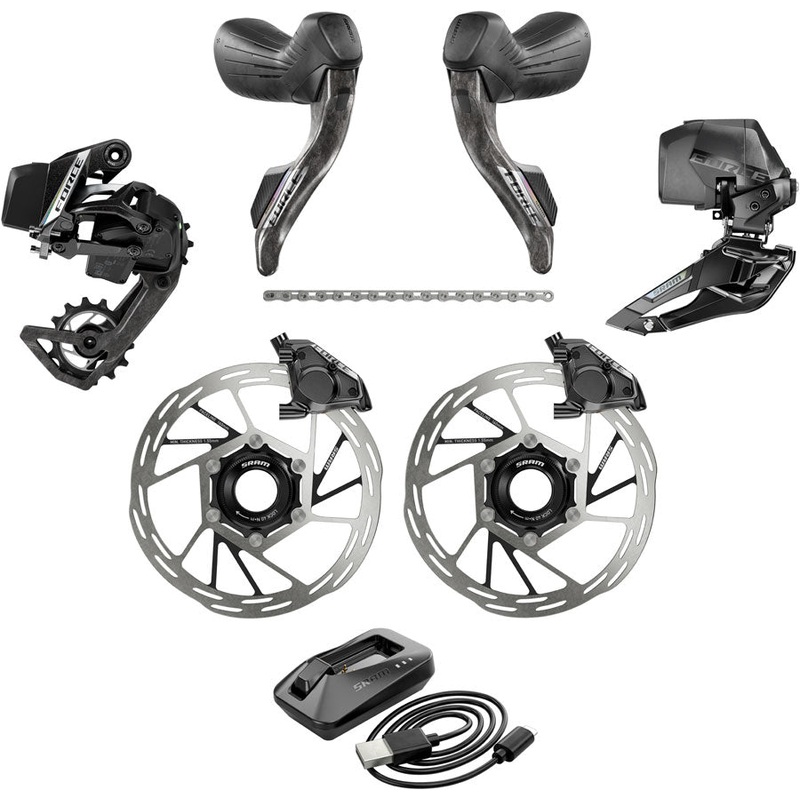 - SRAM Force eTap AXS E1 groupset includes – hydraulic brake/shift eTap lever pair, front and rear flat mount disc calipers, Paceline A2 disc brake rotors, front and rear wireless derailleurs, batteries, charger and cord