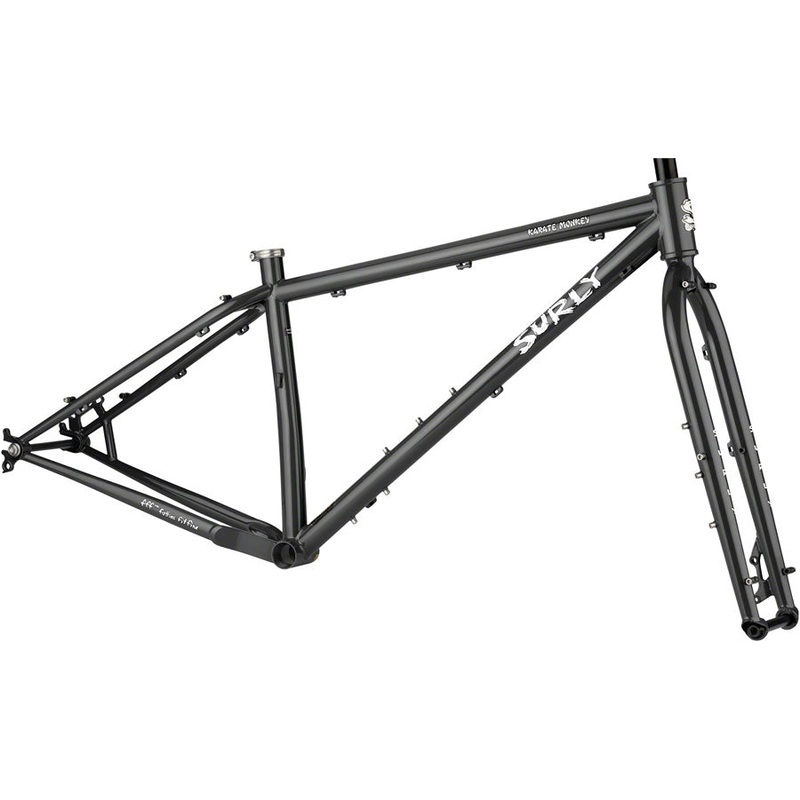 The Karate Monkey frame features updated, progressive trail geometry, a new tubeset and Surlys Gnot-Boost rear dropout system to support multiple drivetrain and wheel size configurations. 100% Surly 4130 chromoly steel frame and fork; double-butted main tr