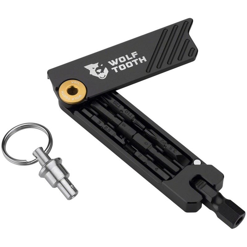 The new Wolf Tooth 6-Bit Hex Wrench is a slim, strong multi-tool with 11 functions for common bike repairs and everyday needs. Six hex bits are stored inside the handles that fit into the end of a ball detent swivel head for use. It is small enough to fit into a riding tool wrap or pocket, and has an optional key ring attachment to fit on any keychain for use away from the bike.