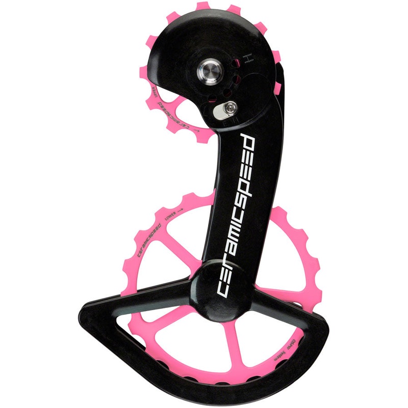 CeramicSpeed OSPW X Pulley Wheel System for Shimano GRX/RX 2×11 – Coated Races Alloy Pulley Carbon Cage Pink Cerakote. The CeramicSpeed Oversized Pulley Wheel System provides optimization and increased efficiency of the rear derailleur through its extremely low-friction bearings and unique overall design.