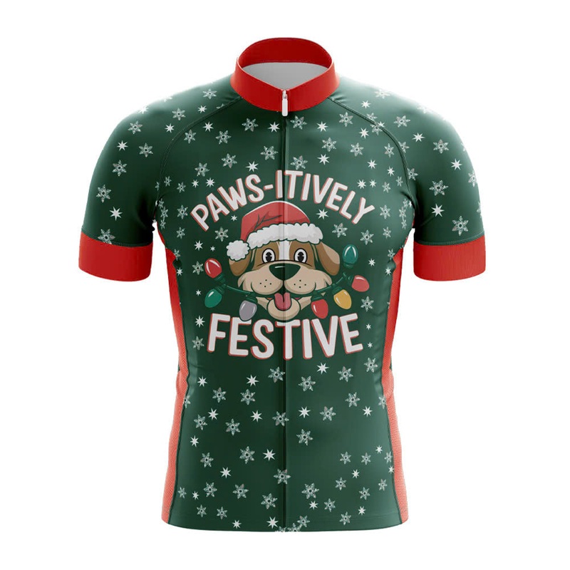 Celebrate the holiday season with the Paws-itively Festive Cycling Jersey. Featuring an adorable dog and Christmas-themed design, this jersey is perfect for spreading holiday cheer on your rides. Comfortable, fun, and festive, its a great choice for cyclists who love the holidays. Discover more cycling gear for pets lovers in the exclusive collections.