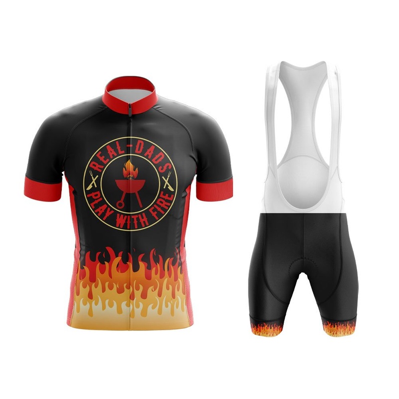 Ignite the trails with the Real Dads Play With Fire Cycling Kit. Celebrating the fiery spirit of fatherhood, this kit showcases a bold barbecue emblem embraced by blazing flames. Crafted for dads who handle the heat, whether at the grill or on the grind.