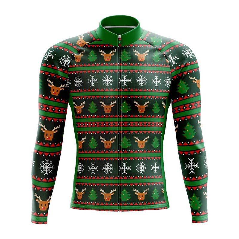 Wrap yourself in holiday cheer with our Reindeer Wrap Long Sleeve Cycling Jersey. This jersey features a unique pixelated pattern of reindeers, snowflakes, and Christmas trees, resembling a festive gift wrapper. Opt for added thermal lining to keep warm during your cold-weather rides.