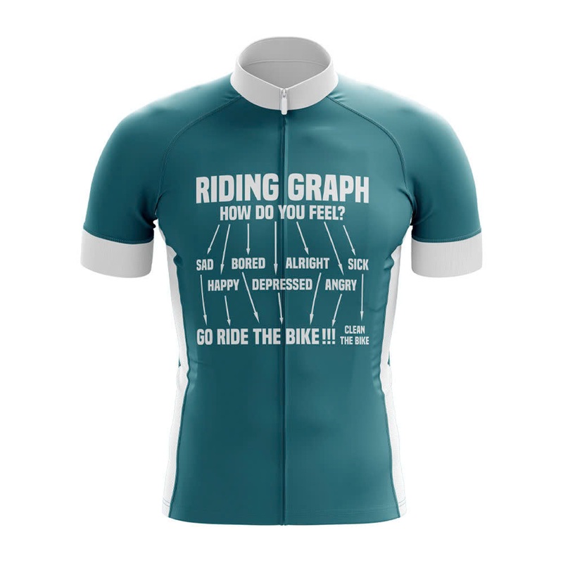 Feeling stressed? The answer is simplego ride your bike! The Riding Graph jersey creatively displays how various emotions all lead to one solution: cycling. A fun and motivating reminder to get out and ride whenever you need a boost.Find more funny cycling