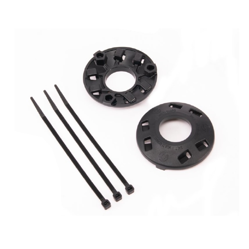 Material- Injected Nylon fibreglass compositeSize- 83mm OD, 34mm ID, 16mm deepFeatures:Universal super strong hub guardDesigned to fit most front hubs with flanges smaller than 58mm ODMade to work with 36h, x3 spoke patternsFits most front hub and some rea