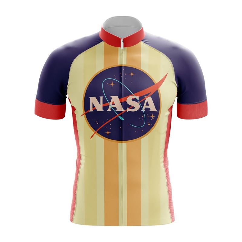 Ignite your cycling adventures with the Solar Flare Retro Cycling Jersey. Clad in vibrant yellow with dynamic orange stripes, this jersey radiates energy and features the nostalgic NASA logo. Its a bold choice for riders who wish to stand out and pay homage to the pioneers of the final frontier.