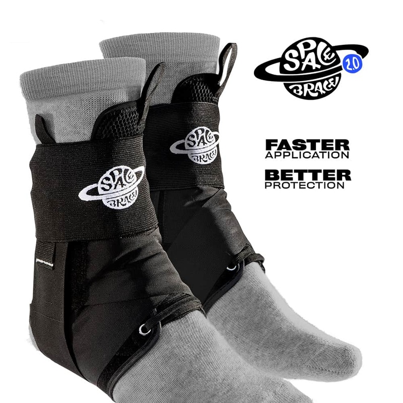 The best just got better!Space Brace 2.0 key features:QUICK LACE TECHNOLOGYMakes application simple and fast. Just undo the velcro easy grips, slip your foot in, and pull across. Thats it!PROTECTIVE PLASTIC INSERTSPrevent ankle bruising and other types of