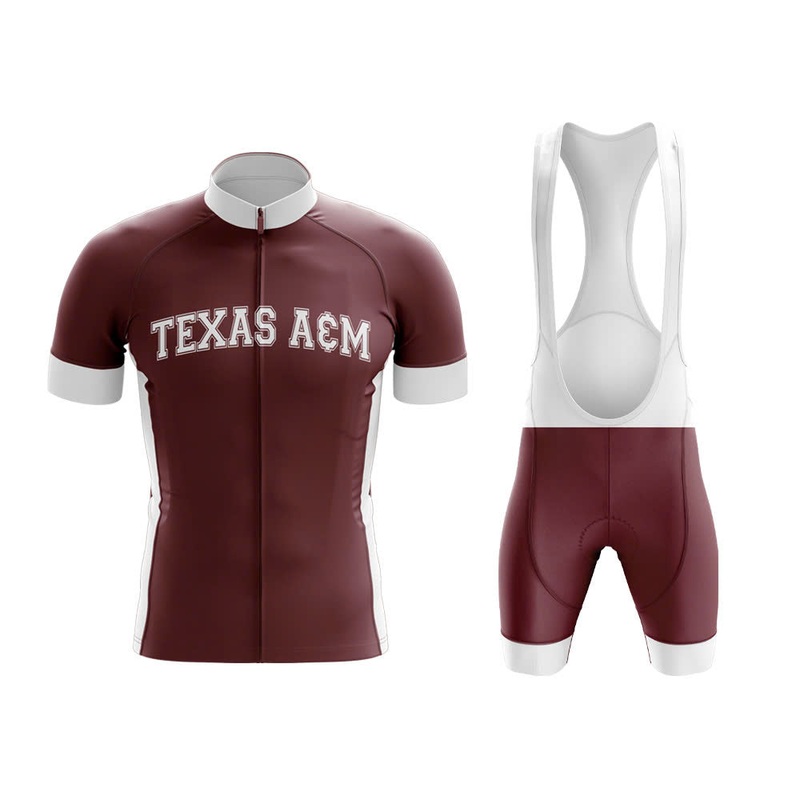 Gig em Aggies! The Texas A&M Cycling Kit combines school pride with top-notch cycling performance. Featuring Texas A&Ms maroon and white colors, this kit includes a cycling jersey and bib shorts designed for comfort and durability. Whether youre on the road or cheering for your team, this kit lets you ride in Aggie style.