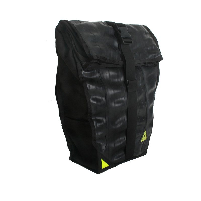 The High Roller is a super durable and sleek bike pannier, made from upcycled bicycle inner tubes and recycled fabric, that serves as a backpack off the bike. With its stormproof construction and striking good looks, it keeps the elements at bay while you ride. The quick mount system secures to virtually any rack system.