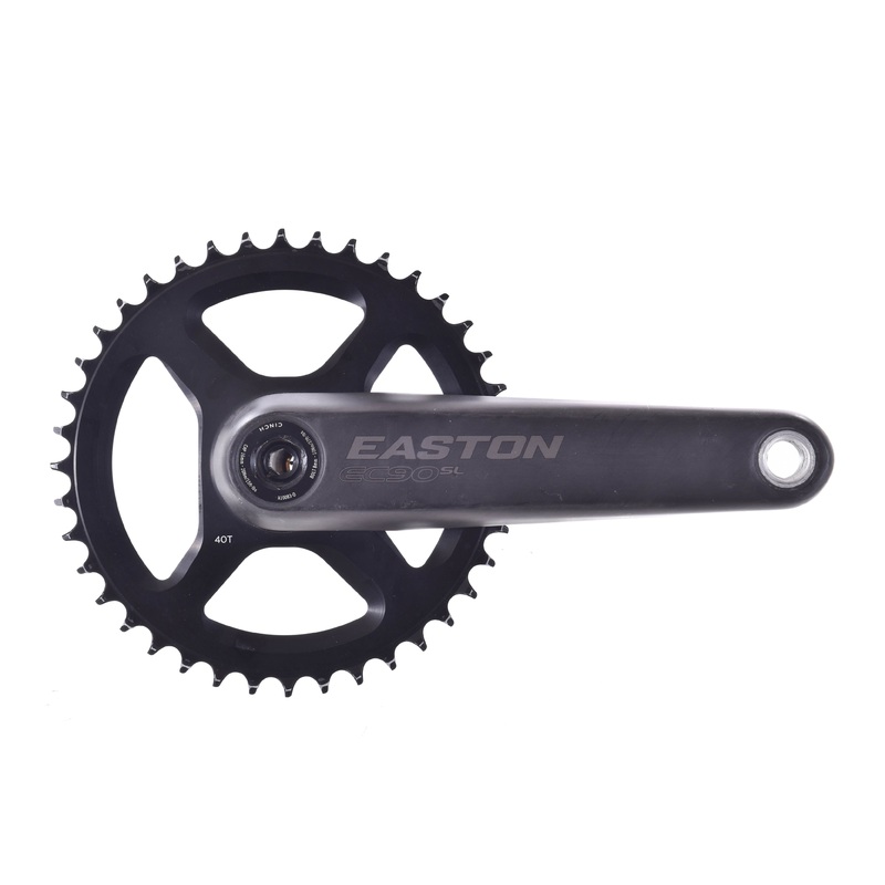 For sale is a USED Easton EC90 SL crankset. The crankset has 175mm carbon arms, a 30mm CINCH spindle, and a 40t direct mount 1x chainring. Also included are a spare spindle and a Wolf Tooth 38t PowerTracelliptical1x chainring.