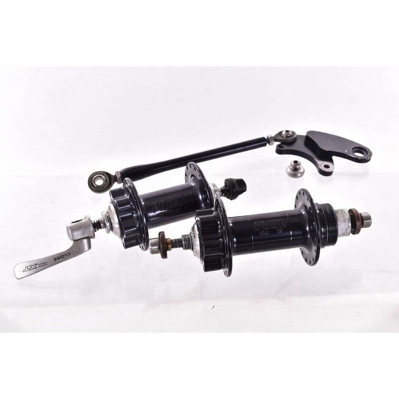 For sale is aset of USED Paul Components USA Single Speed 32H 6 bolt Disc Brake Hubs including a rear disc brake conversion adaptorSPECS:-100mm quick release front hub(including Shimano XT skewer)-135mm bolt-on rear hub, single speed freewheel threading on