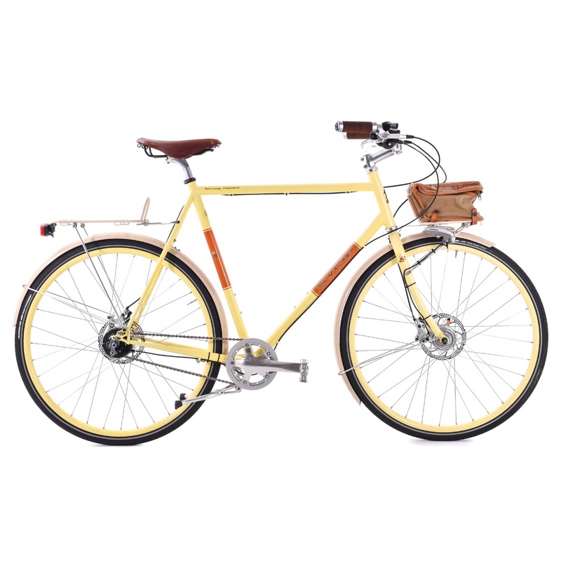 - Extras: Front & rear rack, bag, dymo-powered headlight, taillight, and pedals included